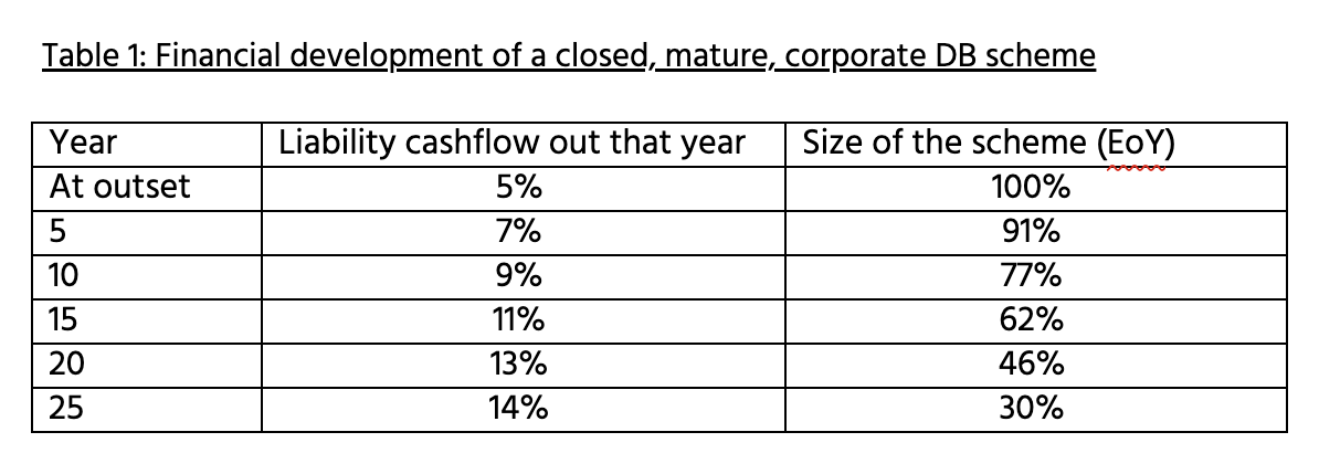 Because a closed DB scheme pays out an ever-increasing proportion of assets in benefits, it folds in on itself. As it becomes super-mature this effect accelerates. Eventually diseconomies (and with it, the governance overhead) diminish the benefits and at that point some form of settlement makes most sense.